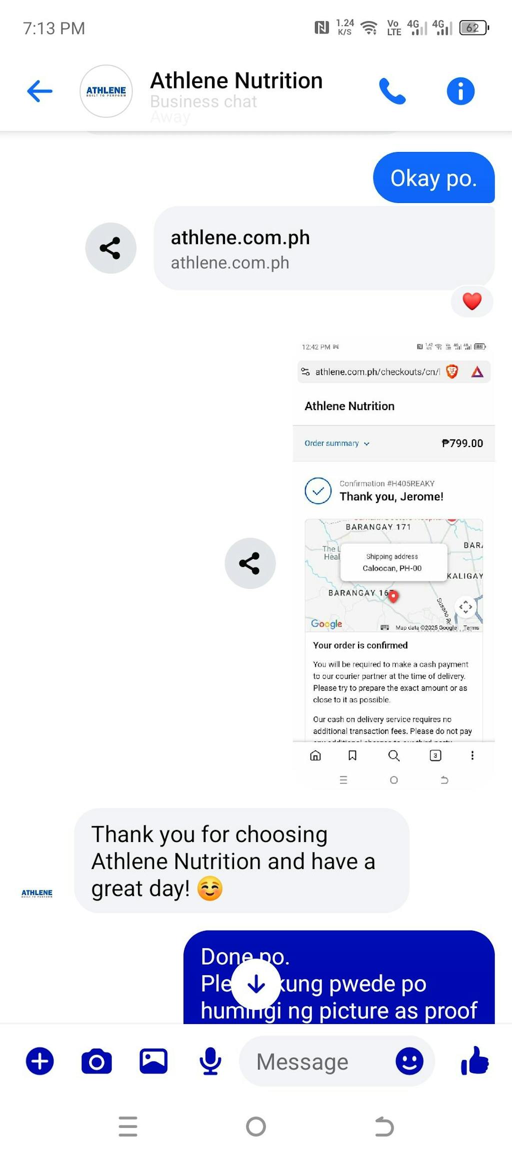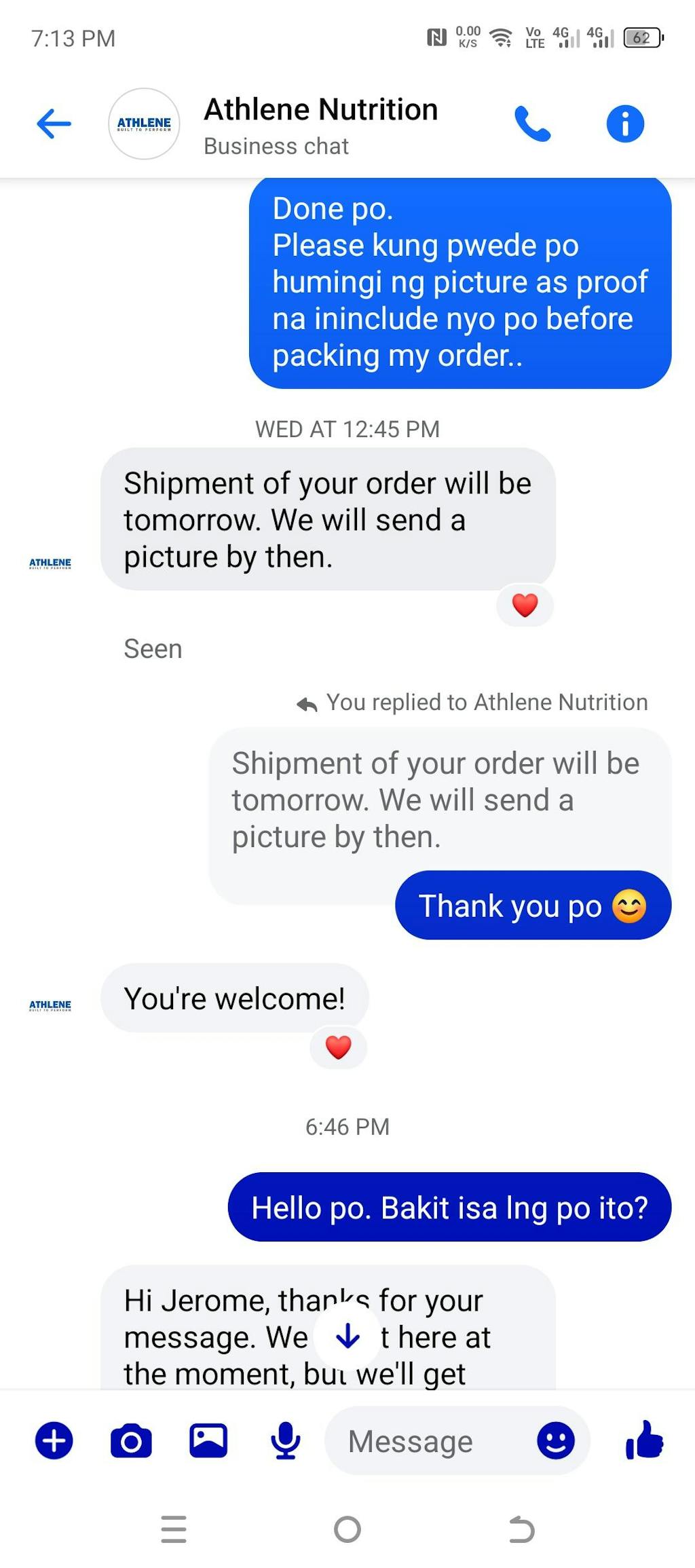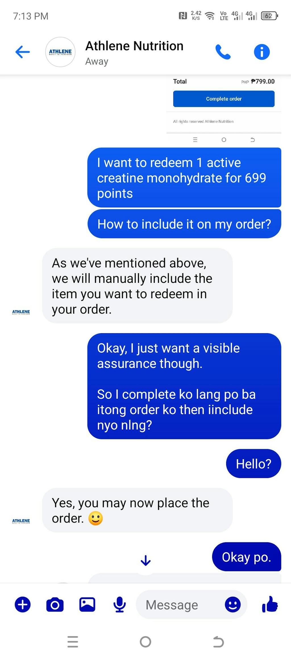 I've been a customer of athlene so I gained a lot of points. I was planning to buy to a friend of mine whose also selling a different brand of creatine but I still choose this athlene so I can get free 1 creatine. I tried to redeem 1 active creatine monohydrate to them and I even ask for a visible assurance that I will get it. The person that I was chatting with on their page also giving me assurance verbally only.